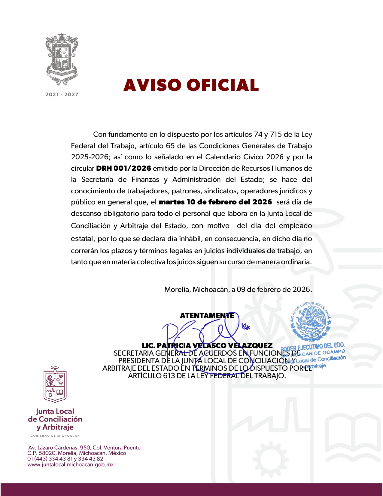 La Junta Local De Conciliación y Arbitraje del Estado de Michoacán hace de su conocimiento de trabajadores, patrones, litigantes y público en general, que el día 10 de febrero de 2026 , es declarado día inhábil con motivo del día del empleado estatal.