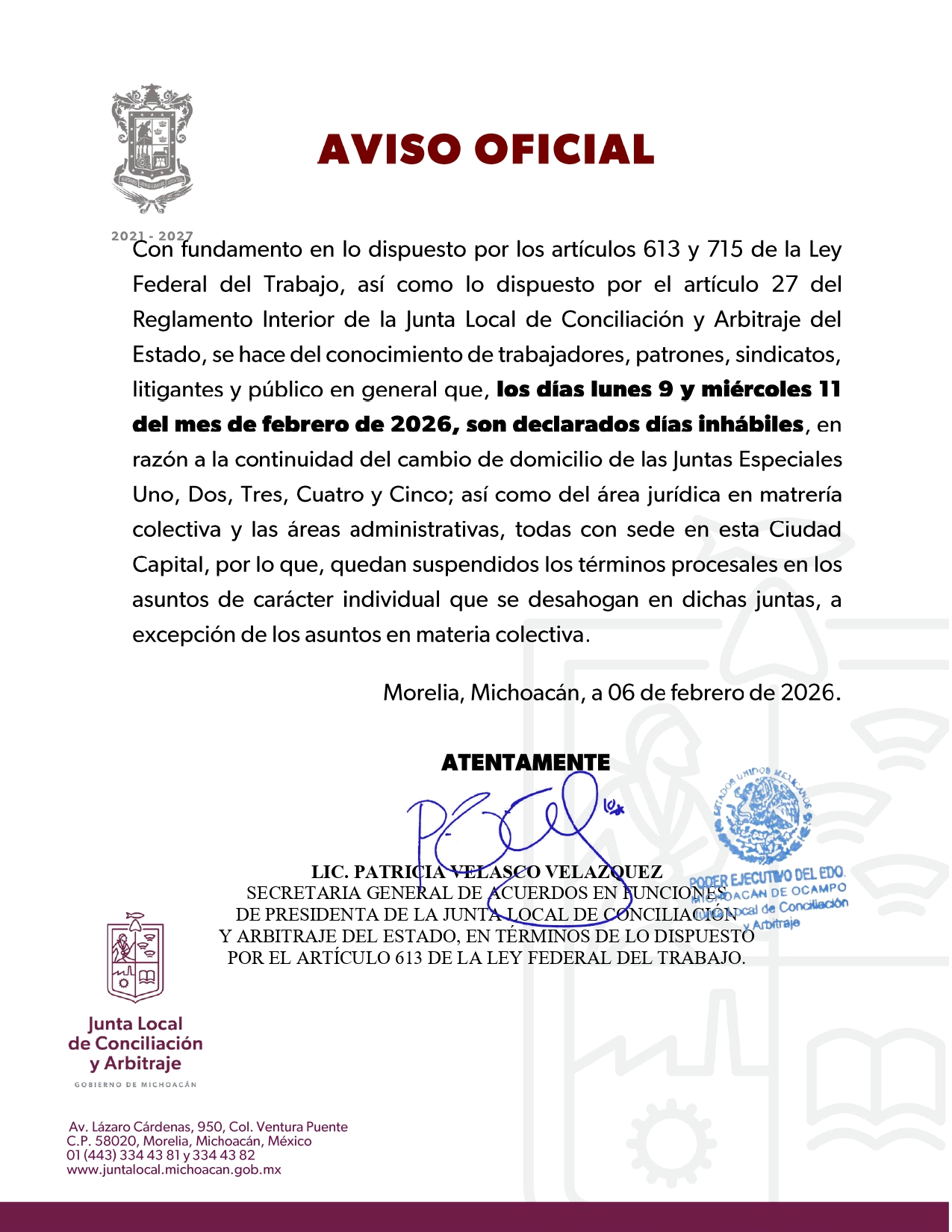 La Junta Local De Conciliación y Arbitraje del Estado de Michoacán hace del conocimiento que los días lunes 9 y miercoles 11 del mes de febrero de 2026, son declarados días inhábiles, en razón a la continuidad del cambio de domicilio de las Juntas Especiales Uno, Dos, Tres, Cuatro y Cinco de la local.