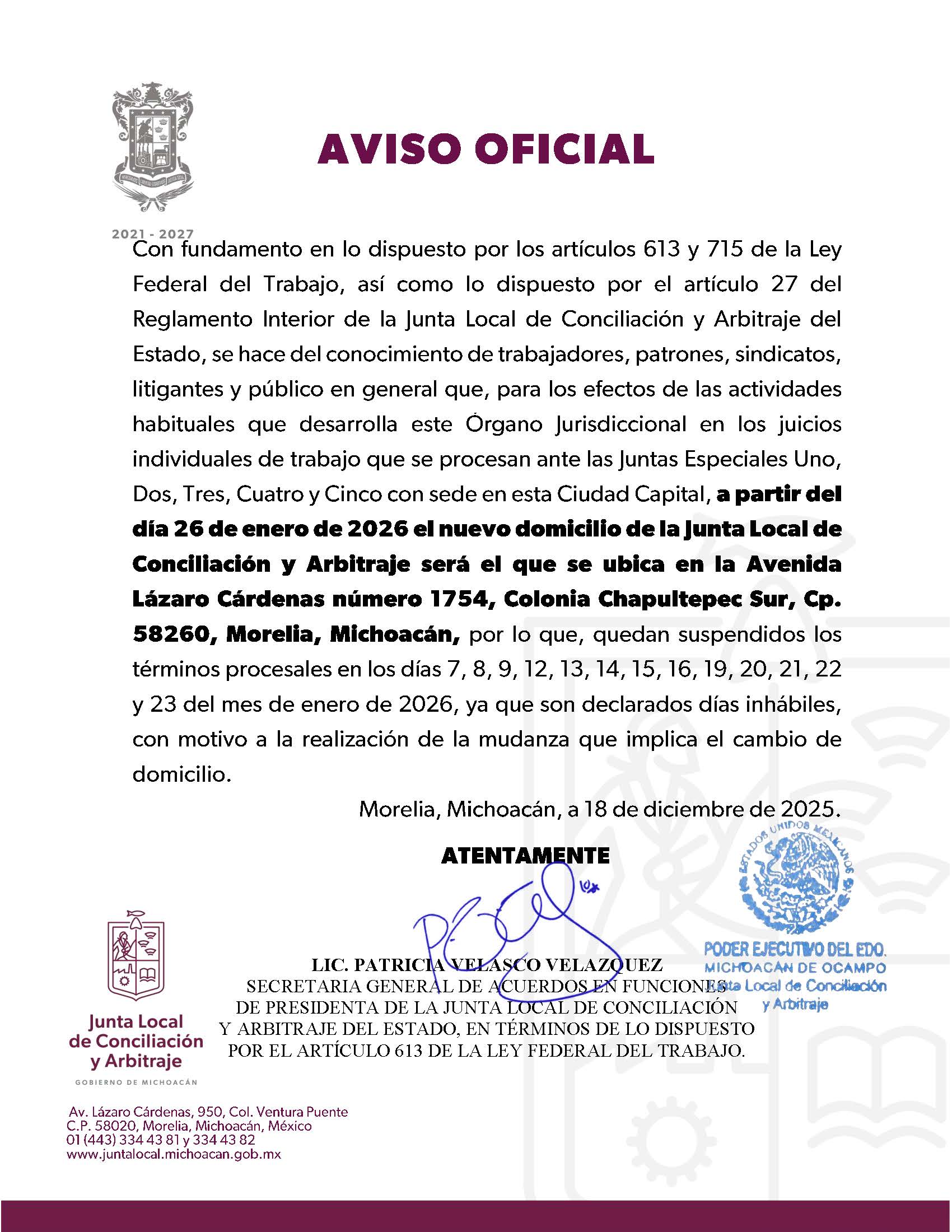 la Junta Local de Conciliación y Arbitraje informa del nuevo domicilio a partir del día 26 de enero de 2026 el cual será el que se ubica en la Avenida Lázaro Cárdenas número 1754, Colonia Chapultepec Sur, Cp. 58260, Morelia, Michoacán