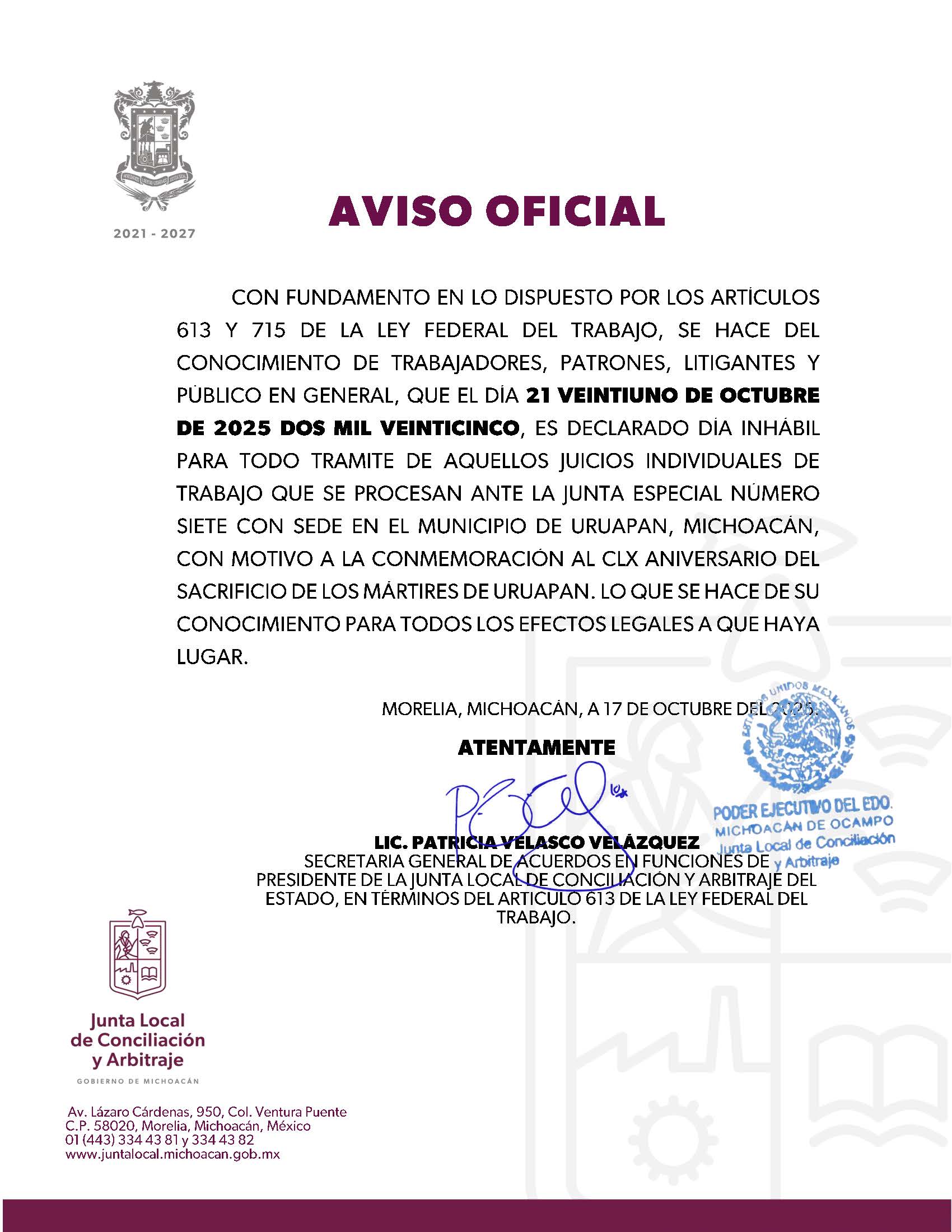Martes 21 veintiuno de octubre de 2025 dos mil veinticinco, es declarado día inhábil para todo tramite de aquellos juicios individuales de trabajo que se procesan ante la Junta Especial número siete con sede en el municipio de Uruapan, Michoacán, con motivo a la conmemoración al CLX aniversario del sacrificio de los mártires de Uruapan.