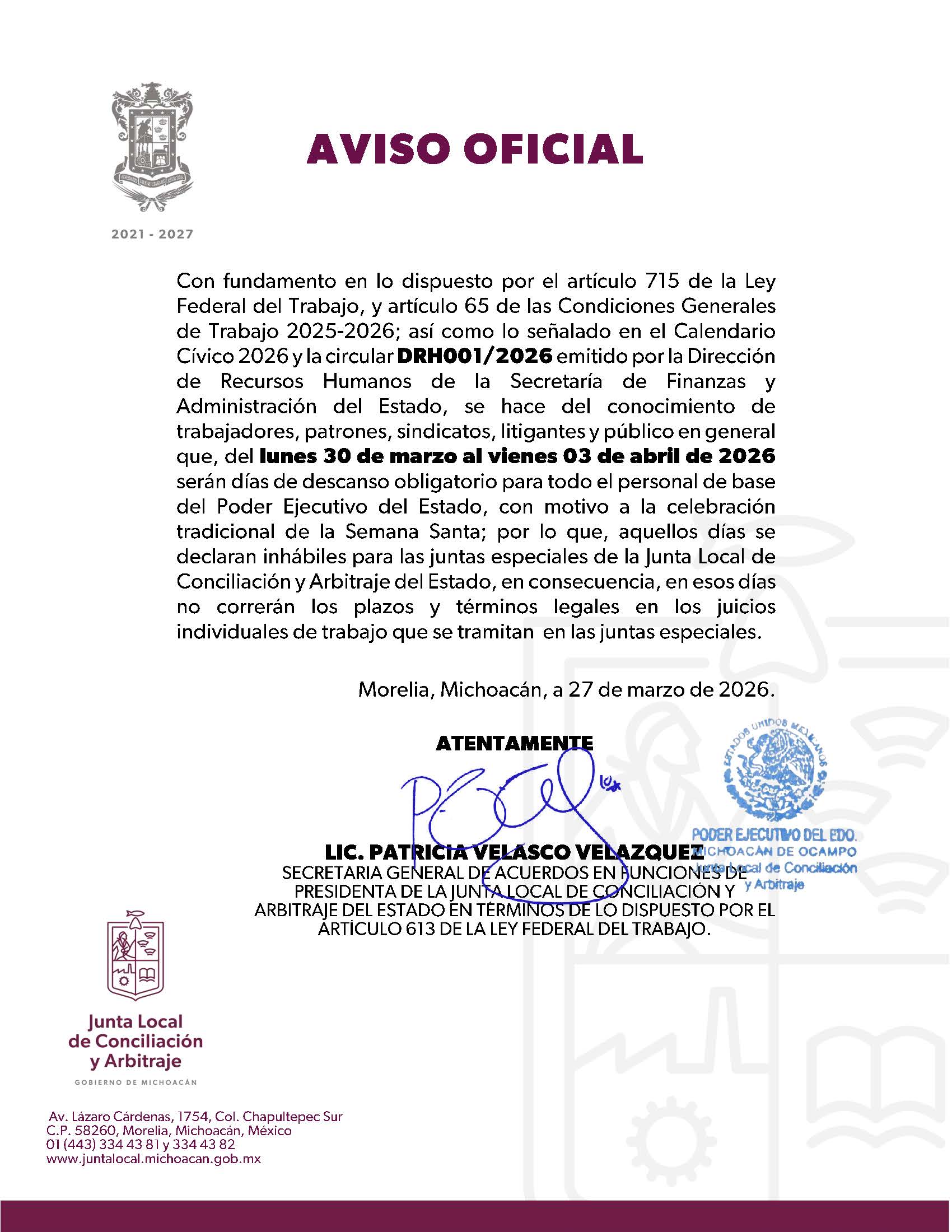 La Junta Local De Conciliación y Arbitraje del Estado de Michoacán hace del conocimiento que, del lunes 30 de marzo al vienes 03 de abril de 2026 serán días de descanso obligatorio para todo el personal de base del Poder Ejecutivo del Estado, con motivo a la celebración tradicional de la Semana Santa.