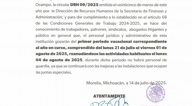 La Junta Local De Conciliación y Arbitraje del Estado de Michoacán hace del conocimiento que el primer periodo vacacional correspondiente al año 2025, comprenderá del lunes 21 de julio al viernes 01 de agosto de 2025, reanudándose las actividades habituales el lunes 04 de agosto de 2025.