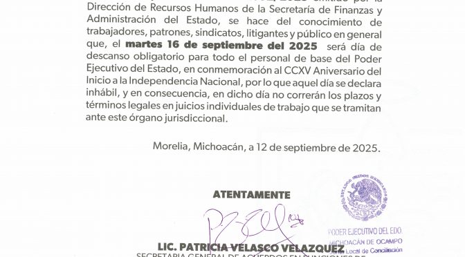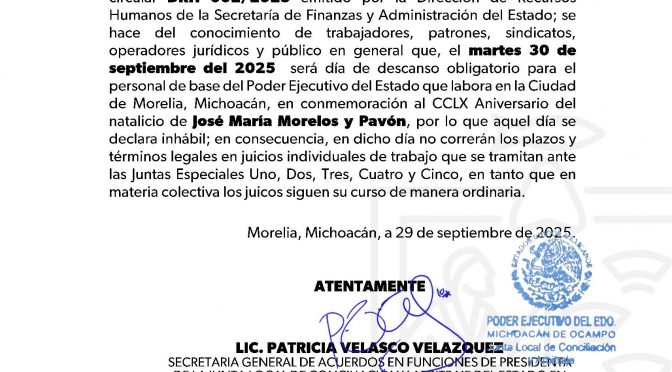 Martes 30 de septiembre de 2025 será día de descanzo obligatorio para todo el personal que labora en las Juntas Especiales Uno, Dos, Tres, Cuatro y Cinco con sede en la ciudad de Morelia, Michoacán