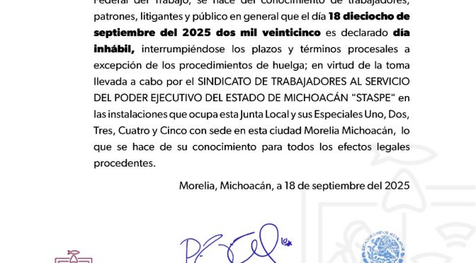 18 dieciocho de septiembre del 2025 dos mil veinticinco es declarado día inhábil, interrumpiéndose los plazos y términos procesales a excepción de los procedimientos de huelga; en virtud de la toma llevada a cabo por el SINDICATO DE TRABAJADORES AL SERVICIO DEL PODER EJECUTIVO DEL ESTADO DE MICHOACÁN “STASPE”
