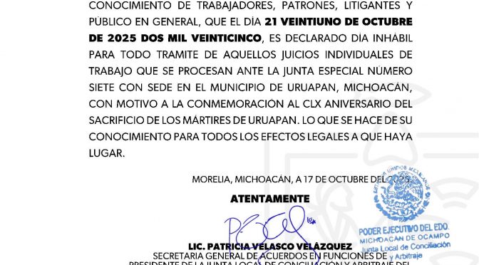 Martes 21 veintiuno de octubre de 2025 dos mil veinticinco, es declarado día inhábil para todo tramite de aquellos juicios individuales de trabajo que se procesan ante la Junta Especial número siete con sede en el municipio de Uruapan, Michoacán, con motivo a la conmemoración al CLX aniversario del sacrificio de los mártires de Uruapan.