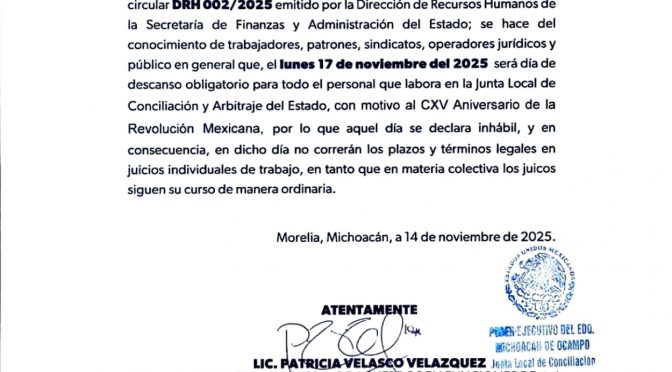 La Junta Local De Conciliación y Arbitraje del Estado de Michoacán hace de su conocimiento de trabajadores, patrones, litigantes y público en general, que el día 17 de noviembre de 2025 , es declarado día inhábil.