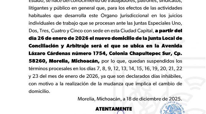 la Junta Local de Conciliación y Arbitraje informa del nuevo domicilio a partir del día 26 de enero de 2026 el cual será el que se ubica en la Avenida Lázaro Cárdenas número 1754, Colonia Chapultepec Sur, Cp. 58260, Morelia, Michoacán