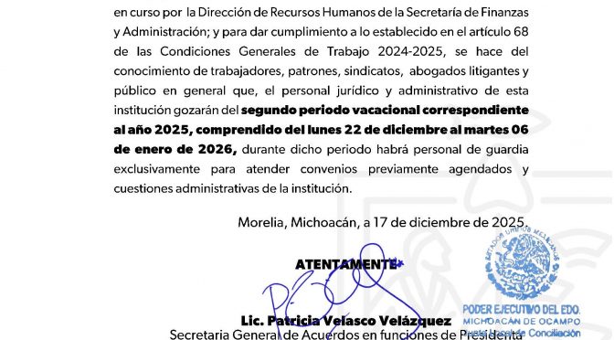 La Junta Local De Conciliación y Arbitraje del Estado de Michoacán hace del conocimiento que el segundo periodo vacacional correspondiente al año 2025, comprenderá del lunes 22 de diciembre al martes 06 de enero de 2026, reanudándose las actividades habituales el miercoles 07 de enero de 2026.
