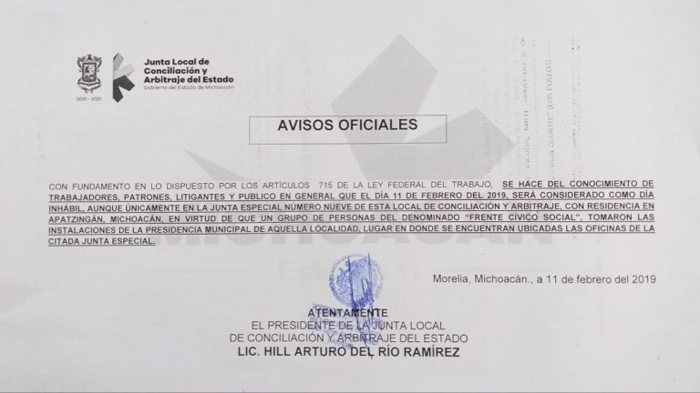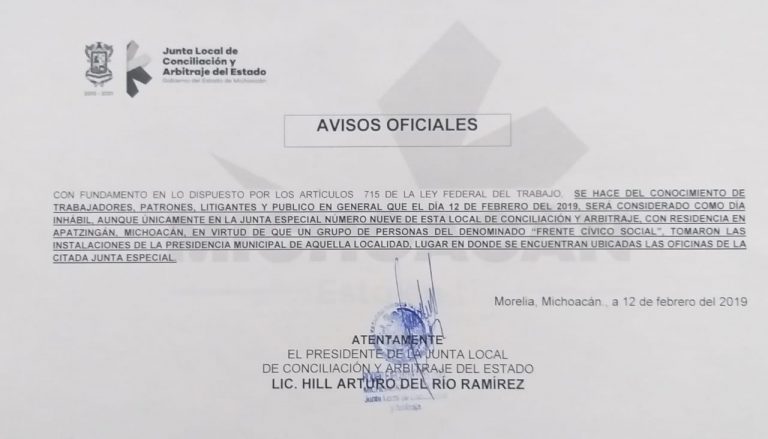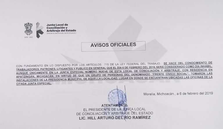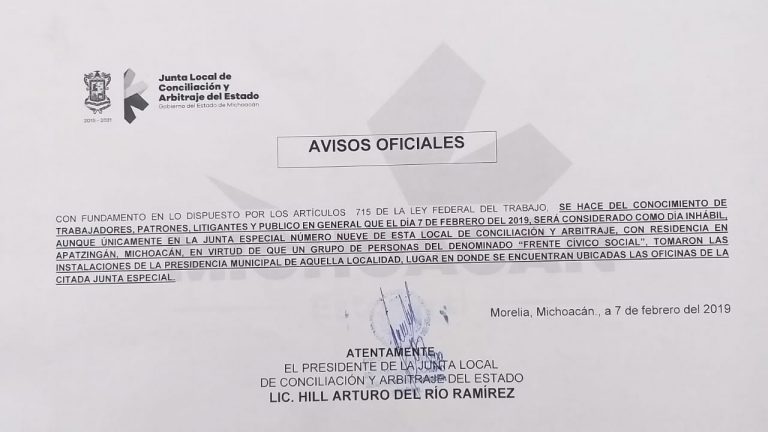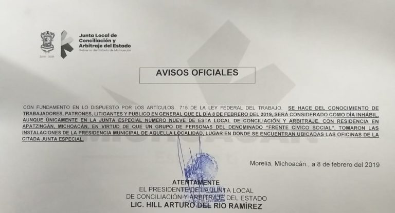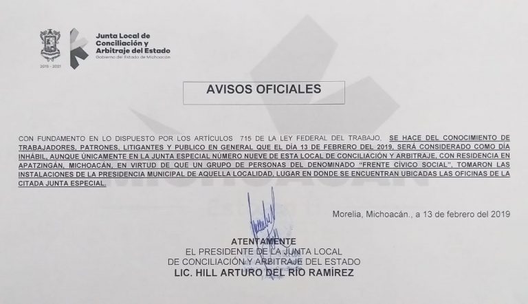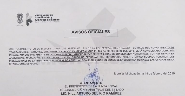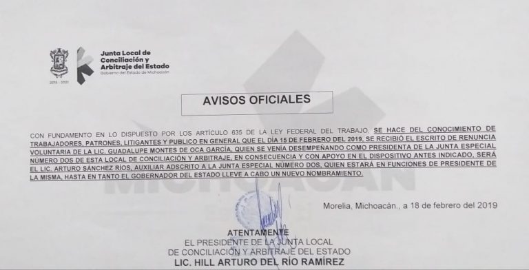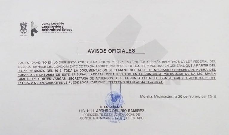 Aviso Oficial de la Junta Local de Conciliación y Arbitraje del Estado de Michoacán