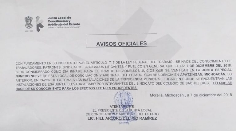 Aviso de la Junta Especial Número Nueve, con residencia en la ciudad de Apatzingán, 18 de Enero 2019 sera día inhábil.