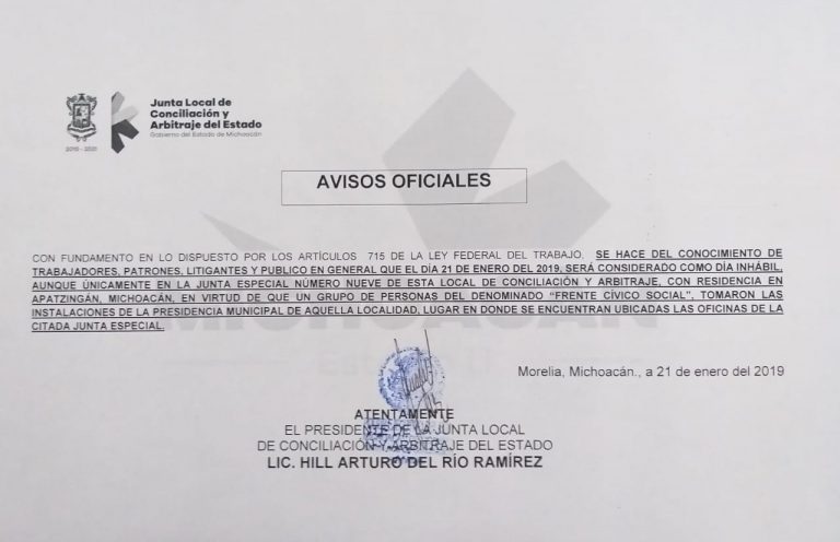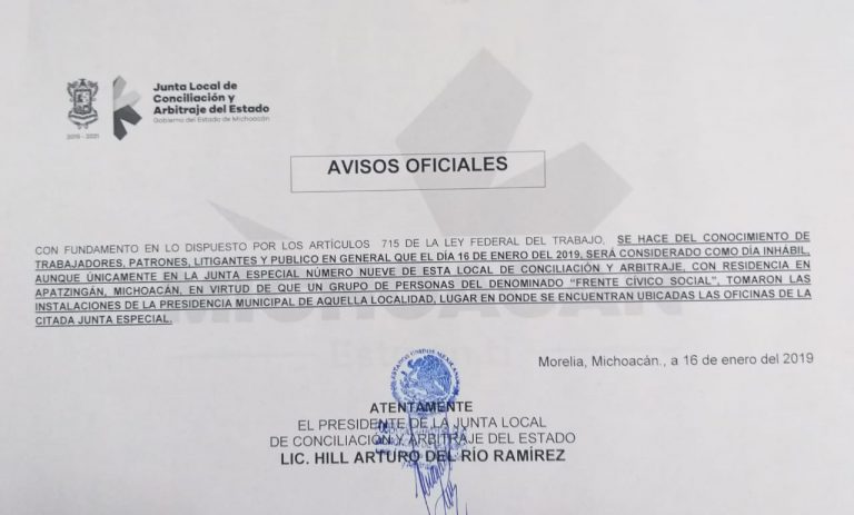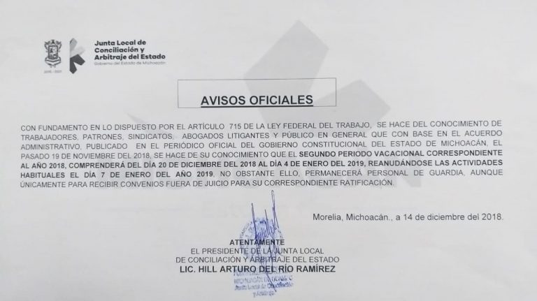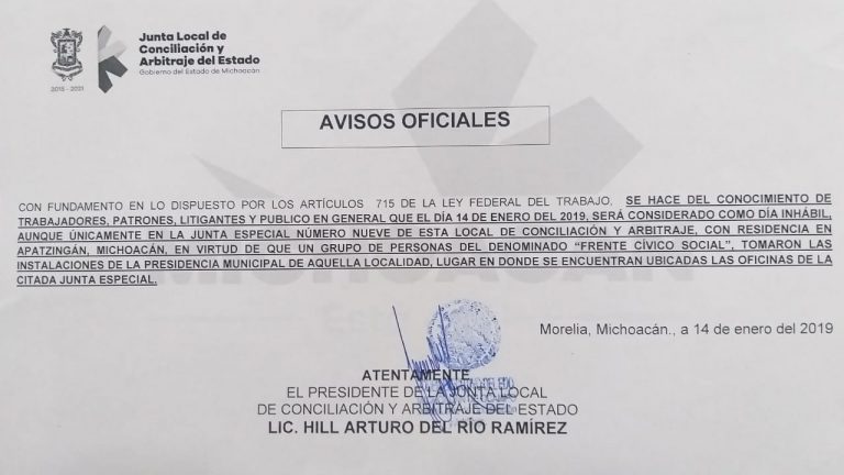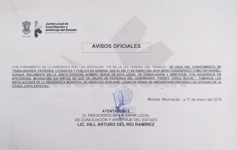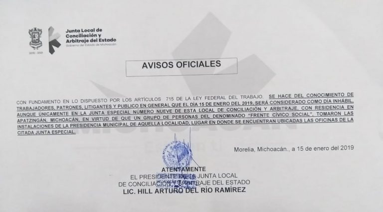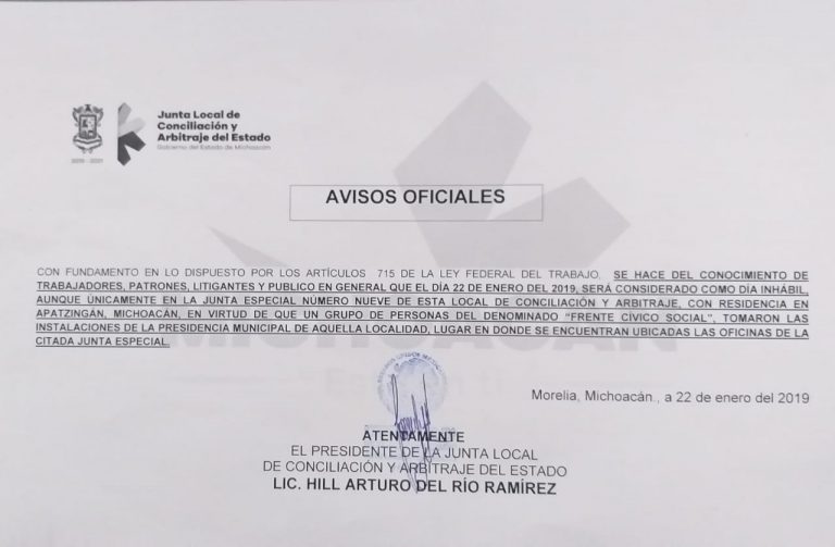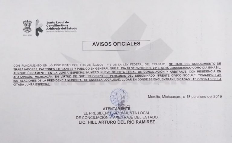 Aviso de la Junta Especial Número Nueve, con residencia en la ciudad de Apatzingán, 22 de Enero 2019 sera día inhábil.