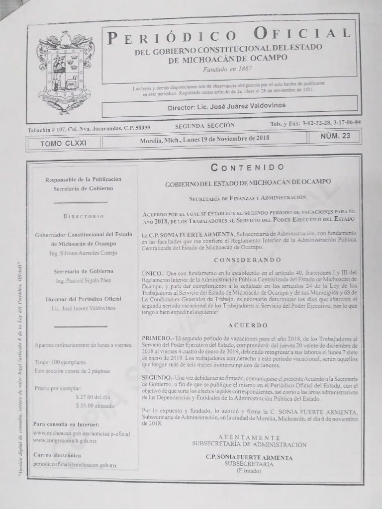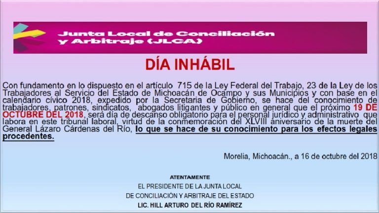 7 de Diciembre del 2018, será considerado como día inhábil en la Junta Especial Numero Ocho, con residencia en Lázaro Cárdenas, Michoacán