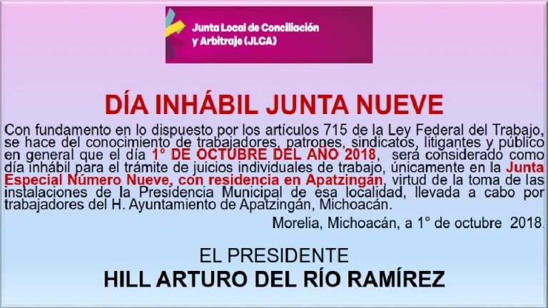 16 de Noviembre del 2018, será considerado como día inhábil en la Junta Especial Numero Nueve, con residencia en Apatzingán, Michoacán