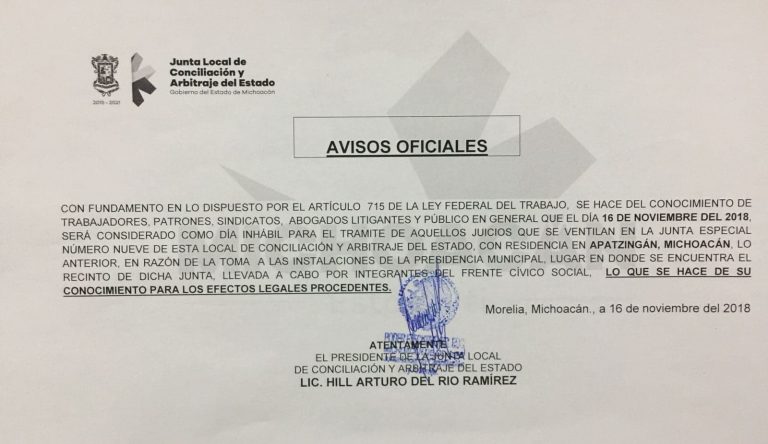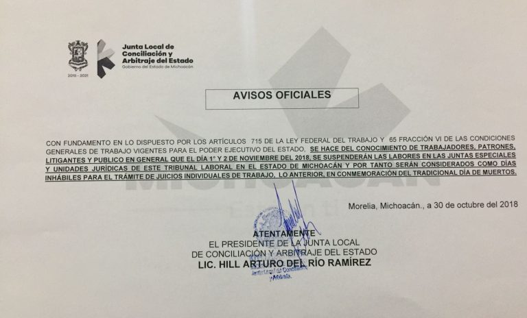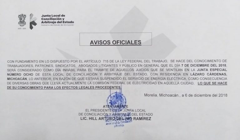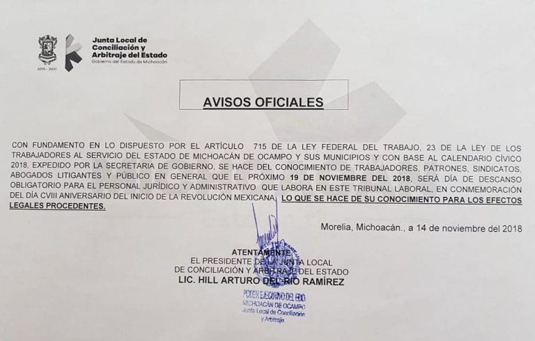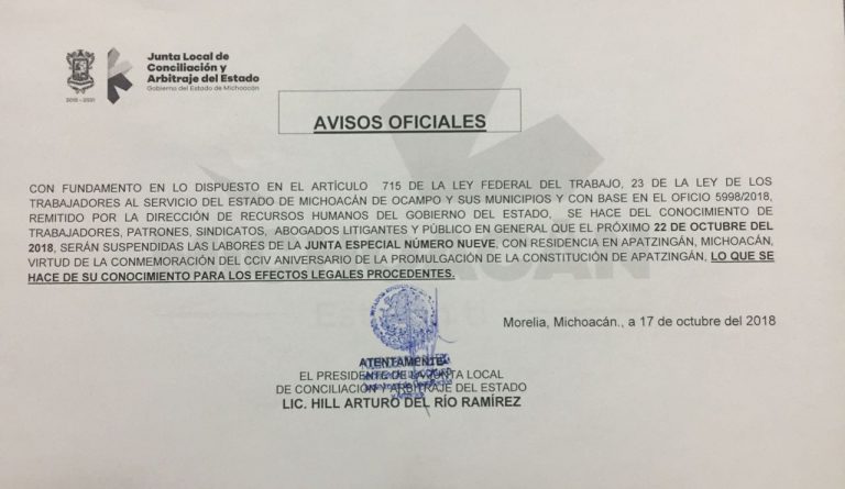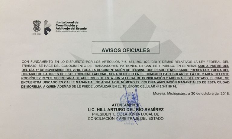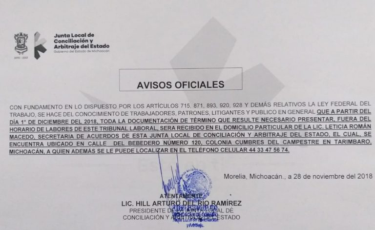 Aviso Oficial de la Junta Local de Conciliación y Arbitraje del Estado de Michoacán